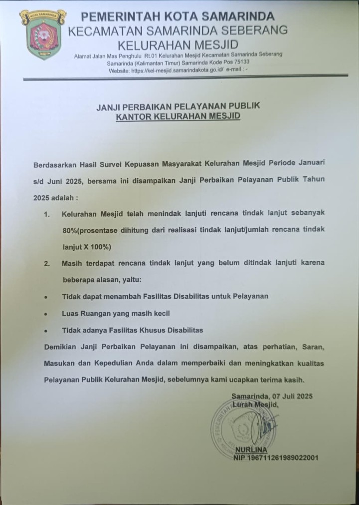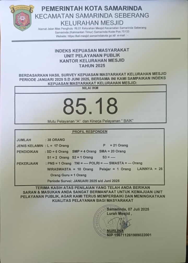 Indeks Kepuasan Masyarakat Unit Pelayanan Kelurahan Mesjid Tahun 2025 Semester 1